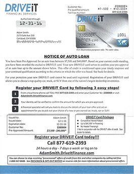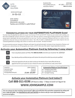 Here is how it works. We are notified every time an automotive hard inquiry has been pulled in your territory. We filter through these daily hard inquiries to see who is pre-qualified for an auto loan between $7,500 and up to $29,000. For those that qualify, a lender backed pre-qualification card mailer is sent within 24-hours via first class mail.